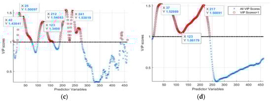 Third, VIP-score-based waveband selection was implemented by computing VIP-score values using Equations (7) and (8). From the computed VIP scores and indices of the wavebands, those which exhibited higher than “1” scores were located. These values were then used to select respective HSI reflectance values.