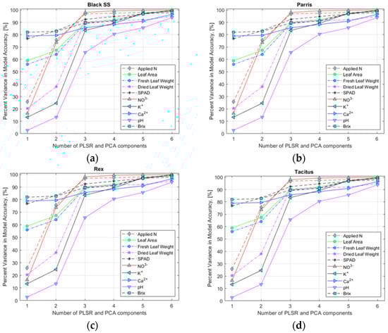 Selection of the number of predictor variable components using the PLSR and PCA models for lettuce cultivars: (a) Black Seeded Simpsons, (b) Parris, (c) Rex RZ, and (d) Tacitus grown in hydroponic tubs with different N concentrations.