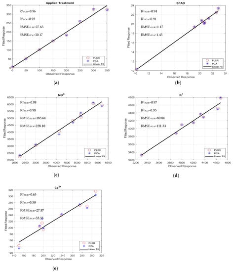 where are score matrices of size and . is the randomly distributed residual error. The found multivariate PLSR and PCA models based on the computed reflectance values of the HSI data were used to predict NO3−, Ca2+, and K+ in ppm; Brix in %; pH- and SPAD-applied N in ppm; and fresh and dry leaf weight (g) of freshly cut leaves. The predicted values of nutrients were computed using the multivariate regression formula given in Equation (4) [].
