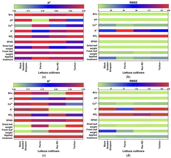 R2 and RMSE values of the investigated parameters of different lettuce cultivars grown in hydroponics (a,b) and in the NFT system (c,d).