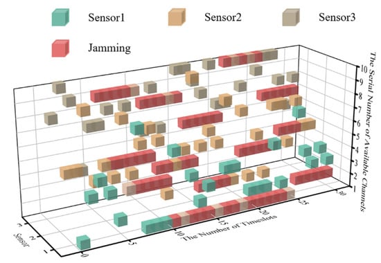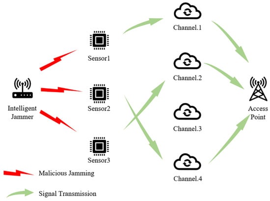 By injecting malicious jamming into the wireless channel, jammers can seriously reduce the performance of wireless sensor networks or even interrupt the transmission [,]. In addition, the insufficient interaction between sensors in the network will easily lead to competition in the same channel, which will lead to failure of transmission and affect transmission performance badly. It is necessary to consider both internal and external factors that affect the transmission performance of wireless sensor networks to optimize the efficiency of the system.