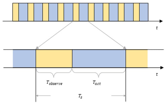 Figure 2. The schematic diagram of single timeslot’s structure. - This paper assumes that the malicious jamming fabricated by the enemy entities is high-power jamming in unit timeslot , which can interrupt and even intercept a sensor’s communication instantly and result in transmission failure. Moreover, all the sensors in the WSN are in jamming’s reach. In order to keep the environment the WSN is working in stable, there is no resources depletion for the malicious jammer from the enemy, which means the jammer can always work and the threat of the malicious jamming is always there. The enemy jammer can sense all the channels used by every node and can select channels with the highest utilization rate at the current stage to exert probabilistic jamming. A single jamming lasts timeslots. However, compared with intelligent jamming assumptions used in reference [], the jamming model used in this paper can change their jamming parameter periodically, which is more intelligent and can be more threatening to the communications among the sensor nodes. In this paper, we define this jamming pattern as multi-channel probabilistic tracking jamming (MPT-jamming).