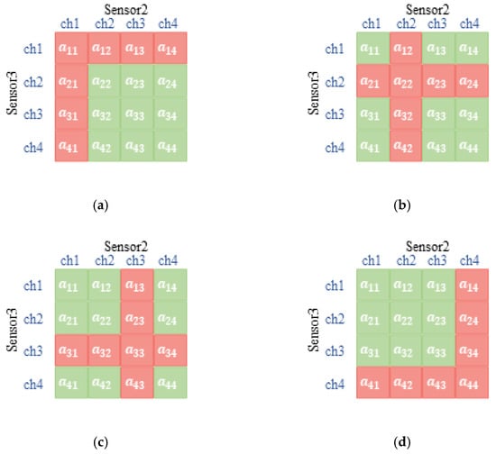 The diagram of the cubic relationship among sensors in sensor 1′s version. (a) Sensor 1 chooses channel 1; (b) sensor 1 chooses channel 2; (c) sensor 1 chooses channel 3; (d) sensor 1 chooses channel 4.