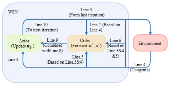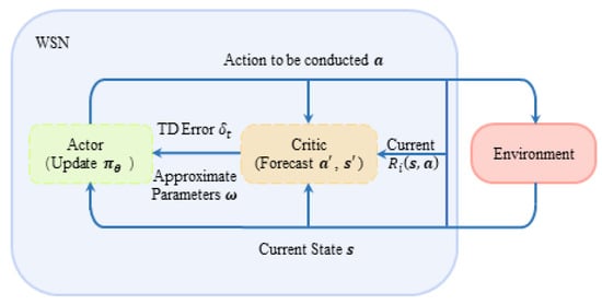 In this paper, an actor–critic-based scheme for a WSN with distributed multi-agent systems is proposed which can improve the anti-jamming communication performance among wireless sensors in the environment of intelligent malicious jamming for WSNs. The proposed scheme increases the system’s operation efficiency by dividing the system’s strategy evaluation and execution into two independent parts, when dealing with external jamming and internal interference. The simulation shows that the proposed scheme can improve the efficiency of communications among the network nodes and has a better ability to learn from internal and external environments, resulting in faster algorithm convergence.
