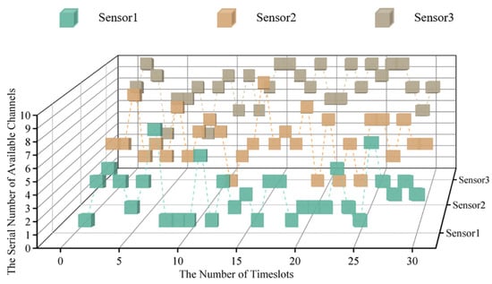 According to Figure 10, the algorithm proposed for WSNs can realize anti-jamming communication applied to a multi-agent system. Compared with JMAA proposed in reference [], each sensor in the system only occupies two channels for convergence, which can be regarded as one primary channel and the other as the standby; here, this paper defines this policy for anti-jamming communication as the ‘One primary, One Standby’ policy. Taking sensor 1 in Figure 10 as an example, the primary channel of sensor 1 is one and the alternative is two. It is worth mentioning that, according to the system settings in this paper, the channel selection of MPT-jamming is based on the channel selected by sensors in a previous timeslot. The intelligent jammer executes MPT-jamming in the next timeslot, lasting five timeslots, so that there is one timeslot difference existing between jamming’s selection and execution naturally. We define the MPT-jamming itself as hysteresis. This phenomenon will affect the application of the algorithm proposed, which will be discussed in more detail later.