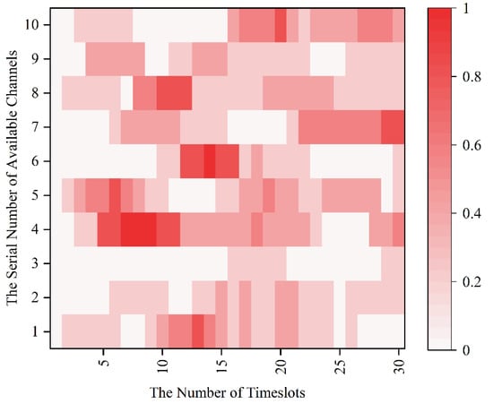Since the MPT-jamming set in this paper is the probabilistic jamming based on the channel selection of sensors in the previous timeslot, the real-time probability distribution diagram of timeslot-channel jamming is drawn for the 0–30 timeslot in Figure 8 according to Figure 7.