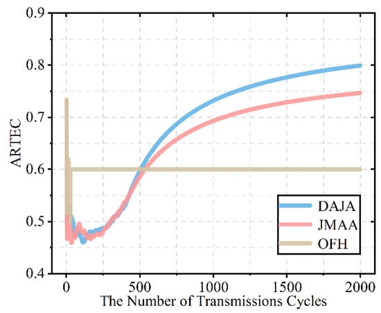- Average Reward of Transmission in Each Cycle (ARTEC). Firstly, we define timeslots, as long as jamming’s duration, as a transmission cycle, so the duration is naturally. The reward of successful transmission in one cycle is the successful timeslot , where is used to distinguish users, the single reward of one user is , and is the number of timeslots, where user transmits successfully in one cycle, and the number of cycles is , . To describe transmission performance, we further define average transmission reward , which is used to describe the average transmission capacity of the algorithm after the cycle. Obviously, ARTEC represents the ability of system’s transmission when facing intelligent malicious jamming, and the higher the value, the better the transmission.