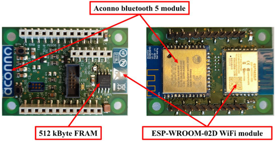 The communication layer of the sensor node is responsible for receiving the pre-processed sensor data and sending them wirelessly to the cloud server. Two types of wireless communication modules were used to achieve this goal: the ESP-WROOM-02D (Espressif Systems, Shanghai, China) Wi-Fi module, which is responsible for sending the sensor data to the cloud server via Wi-Fi protocol, and the Aconno Bluetooth module ACN52840 (Aconno, Düsseldorf, Germany), which is responsible for detecting location information using special Bluetooth-based beacon devices and then sending the location information to the cloud using the Wi-Fi module. The communication layer communicates with the processing layer for data transportation using the SPI bus. The received data were stored in 512 KB ferroelectric RAM at the communication layer to avoid data loss in case of wireless communication problems. Figure 1 shows the used communication layer.