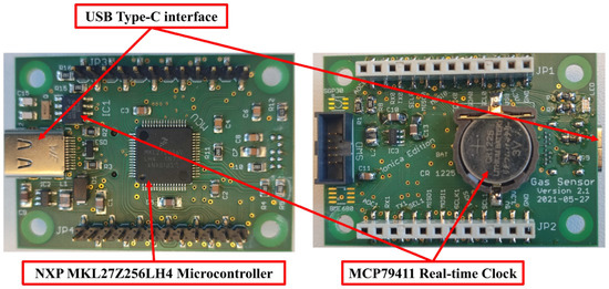 The processing layer is the central layer of the sensor node. It is responsible for sampling, processing, and transferring all sensor data. The main element of the processing node is the NXP MKL27Z256LH4 microcontroller (NXP Semiconductors, Eindhoven, Netherlands), which is a 32-bit ARM microcontroller with a processing clock of 32 MHz. It has all the required buses, such as USB Type-C, I2C, SPI, and UART interface, to communicate with different sensors and modules in the sensor node layers. The USB Type-C bus can be used for powering the sensor node, charging the battery for mobile applications, and system configuration. The processing layer has the MCP79411 battery-backed I2C real-time clock (Microchip Technology Inc., Arizona, USA) for generating a time stamp for sensing layer measurements. Figure 3 shows the front and back sides of the processing layer.