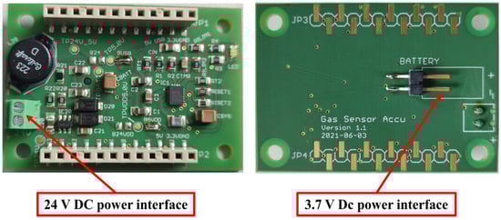 The power layer is an optional layer for providing the power source to the sensor node in case a typical USB Type-C interface is not available in the hosted environments. Two power input interfaces can be provided by the power layer. A 24 V direct DC supply is used for implementation with some types of humanoid and tank robots. The second power interface is for a typical rechargeable battery (3.7 V) which is widely used for mobile applications. The rechargeable battery attached to the second power layer interface can be charged from the first 24 V DC supply interface as well as from the USB Type-C interface of the processing layer board. Figure 4 shows the power layer of the proposed sensor node.