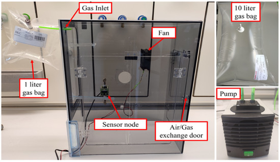 The NOx-Index refers to the levels of nitrogen oxides in indoor air. This index changes with increasing concentrations of NO, NO2, or both (NOx) in the tested air sample. For this purpose, special SKC gas sample pages (SKC, Inc., Eighty Four, PA, USA) of different sizes (1 L, 10 L) and a small electrical pump KNF with a max pressure of 2.4 bar (KNF Neuberger GmbH, Freiburg, Germany) were used for collecting the NO, NO2, and NOx gas mixture from different sources such as a pure NO2 gas bottle, benzene fuel engine exhaust, and diesel fuel engine exhaust. The testing of the nitrogen oxide gases was implemented using a special gas testing chamber designed for this purpose and made of polyvinyl chloride (PVC) (see Figure 5). It has dimensions of 52 cm in height, 42 cm in length, and 30 cm in width with a total volume of 65 L. The gas testing chamber has a small fan to uniformly mix gas samples with the air inside the chamber to ensure accurate sensor response. In addition, the fan is used to evacuate the gas sample from the gas chamber after the testing phase and replace it with fresh air for the next testing phase (the fan continuously works until the sensor measures normal NOx-Index baseline).
