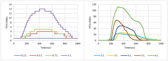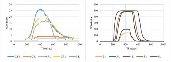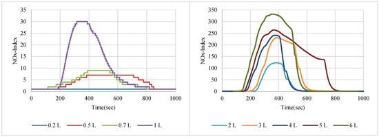 The step response time for the SGP41 sensor for NOx-Index shows that the maximum recorded T90 for the selected samples with two volumes of 1 L and 6 L was 260.1 s for a 1 L of NOx gas mixture sample produced by a benzene engine and the minimum recorded T90 step time response was 113.4 for a 1 L of NOx gas mixture produced by a diesel engine. When comparing the results in Figure 21, we find that the response and recovery times vary at some volumes according to different samples, and this can also be distinguished by referring to Figure 7, Figure 8 and Figure 9, in which some abnormal readings appear that may be due to the SGP41 sensor repeatability [24].