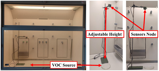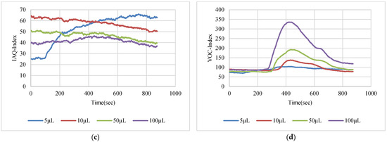 The VOC-Index represents the concentration of the VOCs in the air at five levels from good to hazardous air quality. The SGP41 sensor testing for the VOC-Index was implemented in parallel with the IAQ-Index of the BME688 sensor, which was included in the same sensing layer. Both indexes refer to the level of air quality range from 0 to 500 representing the best to the worst quality range, respectively. The testing was implemented inside a Secuflow fume sample preparation hood (Waldner Holding GmbH & Co. KG, Wangen im Allgäu, Germany) that was designed for chemical sample preparation in laboratories. The SGP41 sensor was tested with 10 different VOC solvents, namely acetone, acetonitrile, benzene, diethyl ether, ethanol, formic acid, hexane, isopropanol, methanol, and toluene. Four volumes (5 µL, 10 µL, 50 µL, and 100 µL) from each VOC were tested. The VOC samples were taken using accurate Eppendorf pipettes (Eppendorf SE, Hamburg, Germany) and injected into a 15 cm diameter Petri dish placed directly under the sensor node. The sensor node was fixed on an adjustable height stand. Two distances (40 cm and 100 cm) between the sensor node and the VOC source were used for system testing. Figure 10 shows the testing hood with used adjustable stand. Figure 11, Figure 12, Figure 13, Figure 14, Figure 15, Figure 16, Figure 17, Figure 18, Figure 19 and Figure 20 show the sensor node test results of the VOC-Index of the SGP41 gas sensor and the IAQ-Index of the BME688 sensor for the selected VOC solvents.