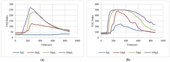 The step time response for the SGP41 sensor for VOC-Index shows that the maximum recorded T90 time is 268.2 s for 100 µL of acetonitrile while the minimum recorded T90 step time response is 96.3 s for 100 µL of benzene. The step time response for the IAQ-Index of the BME688 sensor behaves differently with the selected/tested VOCs, where the maximum recorded T90 is 390.6 for 100 µL of benzene while the minimum recorded T90 response time is 27 s for 100 µL of formic acid. Furthermore, the maximum recorded recovery time for the SGP41 VOC-Index is 1210 s for a 100 µL of methanol sample from a 40 cm distance and the minimum recorded recovery time is 273 for ethanol with the same volume and distance. Moreover, the maximum recorded recovery time for the BME688 IAQ-Index is 1300 s for a toluene sample, and the minimum recorded recovery time is 353 for benzene for a 100 µL volume and 40 cm distance. All recorded response and recovery times are functional for the work, where the alarm indication can be activated during the recovery time after the first confirmed danger level measurement.