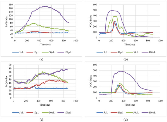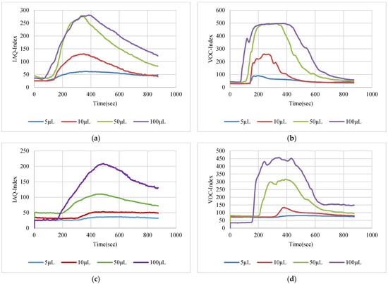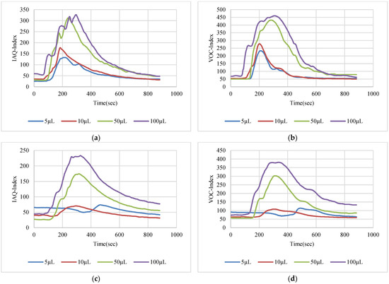 Test results for acetone: (a) BME688 40 cm, (b) SGP41 40 cm, (c) BME688 100 cm, (d) SGP41 100 cm.