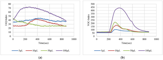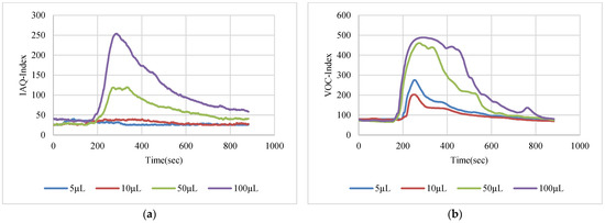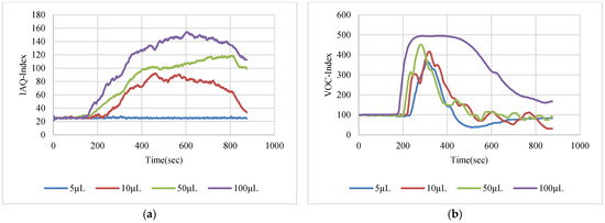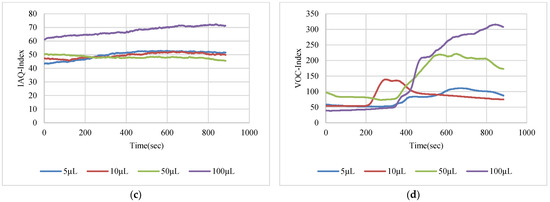 Comparing the current results of the general performance of the SGP41 gas sensor with the results in previous studies [11,13,19] for SGP30, SGP40, and BME680 shows that the SGP41 sensor has a better response to most of the VOCs that were previously tested, in addition to its better selectivity due to it containing an additional sensing layer for nitrogen oxides, which makes it a better choice for new designs of air pollution monitoring devices and harmful gas detectors.