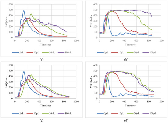 Test results for toluene: (a) BME688 40 cm, (b) SGP41 40 cm, (c) BME688 100 cm, (d) SGP41 100 cm.