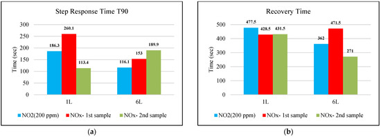 (a) SGP41 step response time T90 for NOx gases, (b) SGP41 recovery time for NOx gases.