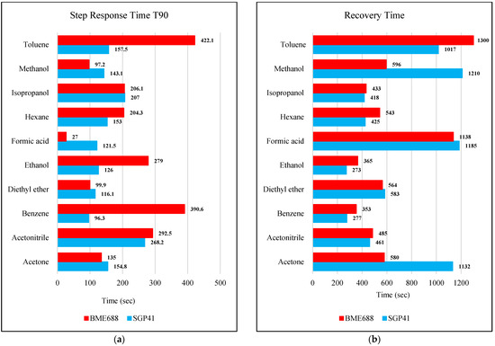 (a) SGP41 VOC-Index and BME688 IAQ-Index step response time T90 for selected VOCs of 100 µL volume from a 40 cm distance between the sensors and the leakage source, (b) SGP41 VOC-Index and BME688 IAQ-Index recovery time for selected VOCs of 100 µL volume from 40 cm distance between the sensors and the leakage source.