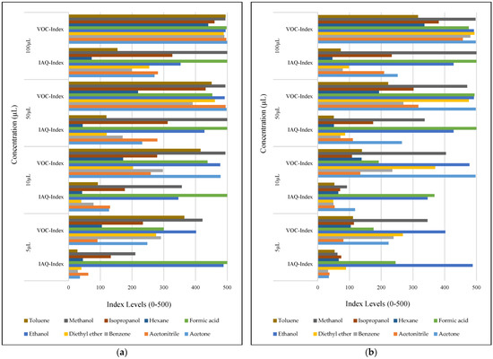 The VOC-Index (SGP41 sensor) and IAQ-Index (BME688 sensor) testing revealed that both sensors have a good response to all tested solvent volumes. The response of the SGP41 sensor is better than that of the BME688 for 9/10 of the tested VOCs, whereas the BME688 shows a better response to formic acid. As one of the purposes of the system design is to alarm the workers in the target environment in case of any dangerous levels of toxic and hazardous gases, a threshold should be selected for triggering the alarm. In the presented work, a 200 VOC-Index and IAQ-Index can be used for this purpose. Based on that, the sensor response for the two used test distances is summarized in Table 1. The results in Table 1 revealed that the SGP41 sensor can detect all the VOC solvents ≥ 100 µL from both test distances. The BME688 failed to detect benzene, diethyl ether, hexane, and toluene from a 100 cm distance and failed to detect the alarm threshold for hexane and toluene from a 40 cm distance. These results are very encouraging for the adoption of SGP41 as one of the main gas sensors in our sensor node. Figure 23 shows the maximum readings for each material with different concentrations for both IAQ-Index and VOC-Index (a) from 40 cm and (b) from 100 cm.