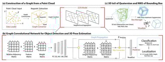 We propose a method for object detection and pose estimation in point clouds. As shown in Figure 1, the overall architecture comprises three components: (a) graph construction, (b) GCN of iterations, and (c) 3D IoU of quaternion and non-maximum suppression (NMS) of bounding box. Our architecture of the point cloud-based GCN model combines the keypoint attention mechanism, which can merge the neighboring features, with the main hierarchical types of graph convolution, skip connection, and readout.