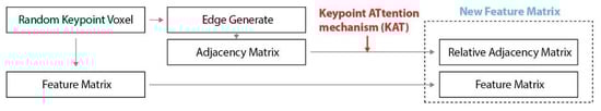 Figure 2 is the flow of the Graph Converting process for extracting keypoints of our method and generating graphs with keypoints as vertices. The point cloud, structured as a graph, is expressed in the form of a sparse matrix, because keypoints are connected according to a certain range, and not all keypoints are connected. The adjacency matrix is expressed in a form that does not connect itself when a loop does not exist. In this case, there is a problem, in that the feature of the vertex itself is not included in the feature matrix and the later matrix multiplication operation. To solve this problem, a general GCN creates an adjacency matrix that reflects the loop, including the vertex itself. When a vertex point includes its features, it creates a loop that connects itself to create an original adjacency matrix that is added to the existing edge list. The original adjacency matrix generated in this manner can indicate the connection state between points, but does not contain information about the relative distance from the vertex point. Our method is based on graph node attention. Graph attention networks (GATs) use attention to learn the relative weights between two connected nodes in message passing []. We propose the Keypoint Attention Mechanism (KAT), which introduces the concept of GAT, which includes different weights for each vertex. The KAT calculates the attention for node pairs and and uses the relative adjacency matrix to reflect the relative information between points in the GCN structure. The relative adjacency matrix is obtained through the difference between the adjacency matrix, representing the connection relationship and points in the degree matrix representing the number of edges of the points.