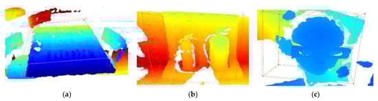 In the study, we used the RGB-D Dataset 7-Scenes []. The dataset is a collection of tracked RGB-D camera frames and can be used for the evaluation of methods for different applications, such as dense tracking, mapping, and re-localization techniques. For our experiments, the dataset was converted into high-density 3D point cloud ply-format data using RGB and depth images, as shown in Figure 7. For the network performance experiment, several sequences were divided into separate training and test sets for each scene as a class.