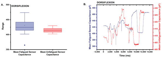 (A) Box plot of the statistics comparing the mean capacitance of the fatigued sensor to that of the unfatigued sensor in dorsiflexion. Note that the mean capacitance is higher for the fatigued sensor. (B) Plot comparing the mean capacitance of the fatigued sensor to the unfatigued sensor during the dorsiflexion trials.