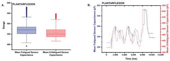 (A) Box plot of the statistics comparing the mean capacitance of the fatigued sensor to that of the unfatigued sensor in plantarflexion. Note that the mean capacitance is higher for the fatigued sensor. (B) Plot comparing the mean capacitance of the fatigued sensor to the unfatigued sensor during the plantarflexion trials.