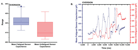 (A) Box plot of the statistics comparing the mean capacitance of the fatigued sensor to that of the unfatigued sensor in eversion. Note that the mean capacitance is higher for the fatigued sensor. (B) Plot comparing the mean capacitance of the fatigued sensor to the unfatigued sensor during the eversion trials.