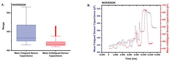 (A) Box plot of the statistics comparing the mean capacitance of the fatigued sensor to that of the unfatigued sensor in inversion. Note that the mean capacitance is higher for the fatigued sensor. (B) Plot comparing the mean capacitance of the fatigued sensor to the unfatigued sensor during the inversion trials.