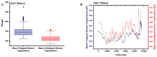 (A) Box plot of the statistics comparing the mean capacitance of the fatigued sensor to that of the unfatigued sensor during the gait trials. Note that the mean capacitance is higher for the fatigued sensor. (B) Plot comparing the mean capacitance of the fatigued sensor to the unfatigued sensor during the gait trials.