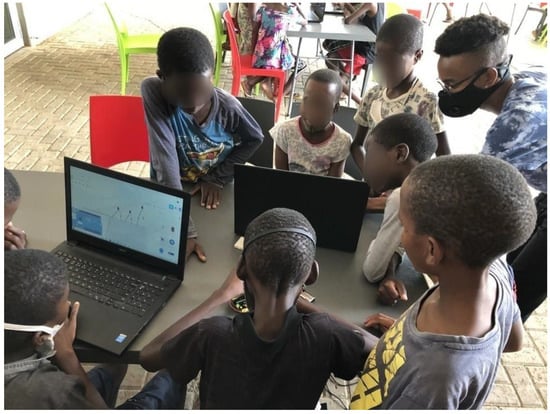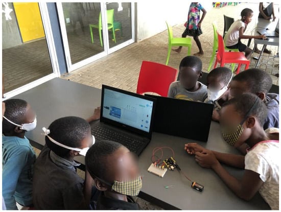Electronics, on the other hand, is defined as the branch of physics and technology that involves the design of circuits using transistors, microchips, and other components []. Anyone who starts working with robotics must understand the basics of electronics for safety reasons of both the robotic components and the human beings. In general, ER activities and initiatives have increased entering schools in the past years, and this could be because ER activities are believed to trigger motivation in learners and students which then stimulates the learning process [,]. An educational robotics workshop was given to grade 6 and 7 learners at Nakayale Private Academy, a charity school located in Etunda area near Ruacana, in Omusati region deep down in the Northern part of Namibia. The aim of this workshop was to equip learners with robotics skills, and this involved the learners’ first-time exposure to both text-based and visual programming. The learners also got to apply the loop structure well, given the fact that they acquired knowledge on programming for the first time at the workshop and this is discussed later in this paper.