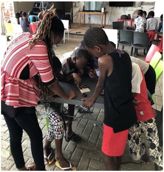 The workshop was attended by 24 primary school learners from Nakayale Private Academy, a charity school in the northern part of Namibia. Nakayale Private Academy was established in January 2016 with the aim of improving the livelihood of children from the marginalized community and orphans who are being neglected by providing them with access to high quality education and providing them with literally everything from free tuition fee, basic needs, accommodation, healthcare and world class educational exposure []. Three numbers of groups were formed at the beginning of the workshop and the same groups were kept throughout the workshop. All the groups had equal gender representations totaling to 8 females and 16 males aged between 12 and 13.
