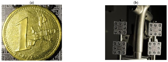 Photogrammetry can generate a geometrically accurate and dense model of a real-world object from a series of images of an object or a scene taken from various viewpoints under the assumption of known materials and lighting conditions [,]. However, it is still challenging to achieve high-accuracy 3D measurement of non-collaborative objects (Figure 1) due to the sensitivity of photogrammetry to the textural properties of the surface [,,]. For example, when the surface of an object is featureless or displays repetitive patterns, all methods based on feature extraction face difficulties in finding a sufficient number of corresponding image points that are needed for image orientation [,]. In case of polished and shiny surfaces, such as industrial and metallic components (Figure 1), the incoming light is subject to the law of reflection and is observed as specular reflection. Such reflections, present in captured images, are undesirable and dense image matching procedures produce noisy results on high-reflective and poorly textured objects (see Figure 2a).