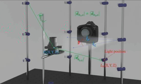 Conventional photometric stereo assumes that the light rays coming from the source are parallel. Providing parallel illumination conditions is more complicated and inefficient to implement in a close-range lighting system. Furthermore, it is also clear that rays coming from the light sources are not parallel anymore, especially when the lighting system is close to the object. Therefore, this impact must be addressed for accurate measurement of the normal surface as any change in light position negatively affects the normal and consequently the resulting 3D reconstruction. For these reasons, we explored a geometric model with punctiform light sources and light divergence as expressed in [,].