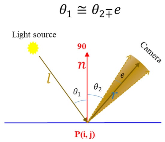 The known camera geometry, lighting system and approximate 3D shape of the object were used to automatically detect shadow and specular reflection and keep only the best-highlighted parts on each image where 3D microstructures and roughness are seen. After capturing multiple images from different stations, the images are automatically inspected, and those regions on each image that appear to result in inferior quality and/or noise (shadow and secularity) are excluded []. To do this, as shown in Figure 5, the incoming angle () and reflected angle () are estimated at each surface point P(x,y,z) corresponding to each pixel (i,j) given the light direction , camera direction and normal using Equations (12) and (13):