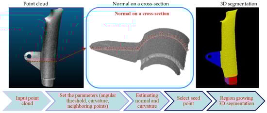 To segment the point cloud, a region growing approach [] is adopted. This method uses local features (point cloud normal and curvature values) obtained from neighbouring points to segment nearby points with similar properties. After obtaining the k-NN for a point p, the salient local 3D features (e.g., point normal, curvature, etc.) are calculated for each point p. The point p with the minimum curvature value is chosen as the first seed point to begin the region growing process. Therefore, the point might be selected in a smoother area on the object where the surface variation is lower. Following the selection of seed points, the region growing segmentation starts and gradually expands by adding new points. Once a first segment is complete according to a region growing criteria [], a new seed point is selected for the following segment.