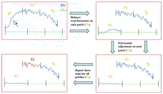 The object is divided into small patches () as illustrated in Figure 7, and then the shape correction is applied to each patch () individually. As a result, the global geometry of the surface in each patch becomes less complicated, with fewer edges and boundaries; hence, the object’s deformation is more likely to be corrected more effectively. To this end, after splitting the object into small patches in the image space, we select the first patch and then, using the corresponding points in both models (photometric stereo and photogrammetry), the patch from the deformed model is roughly transformed and fitted to the course photogrammetric model using helmet transformation. Then, a polynomial adjustment is applied to the same patch to mitigate the deformation locally. This procedure should be performed for next patch () and the remaining patches. Although this approach corrects the global deformation, the model’s 3D details might be negatively affected near the patch’s borders due to disconnectivity. To solve this, two constraints are considered: (i) each patch must have an overlapping area with its neighbouring patches, and (ii) there must be always some corresponding points in the overlapping area to stitch all the patches together.