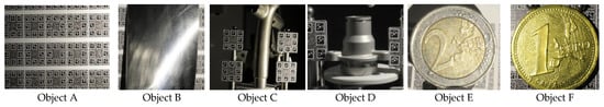 Various objects (Figure 9) with complicated geometry, poor texture, metallic, and shiny surfaces are used for the assessment. Object A is a flat plane covered with a sheet of printed paper that provides a rough surface finishing. The paper shows a printed pattern of circular coded targets and a surrounding random texture. The object can be considered a good Lambertian approximation scattering the incident illumination in all directions equally. On this object, there are no self-shadows or specular highlights in the captured images. Object B is metallic and shiny with a curved shape. The phenomenon of interreflection makes it more complex compared to the other objects. Objects C and D are metallic with less reflectivity while featuring a geometrically complex shape. The image acquisition characteristics of these objects are reported in Table 1.