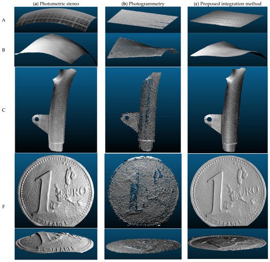 Various researchers combined photometric stereo with other techniques such as structured light or photogrammetry. In the developed methods, high-frequency spatial information is recovered from photometric stereo, whereas other techniques are applied to retrieve low-frequency information. For example, Smithwick and Seibel [] proposed a Single Fiber Scanning Endoscope (SFSE) system for generating dense range maps and 3D measurements based on the merging of photogrammetric disparity and photometric stereo methods, providing precise volume measurements for dosage, risk estimate, and healing progress analyses. Nehab et al. [] combined 3D reconstruction generated from a range scanner with photometric normals to improve the accuracy and level of detail. Hernandez et al. [] used a multi-view geometric constraint from shape from silhouette (SFS) to mitigate photometric stereo’s low-frequency surface distortion. Although this method is simple and flexible, it works only with particular parametric BRDF models []. Several works [,,] combined photometric stereo with RGB-D sensors to derive the 3D details from photometric stereo while improving the low frequency information using RGB-D data. Later, Park et al. [,] then suggested an uncalibrated multi-view photometric stereo (MVPS) approach for recovering precise 3D reconstruction of the object utilizing a coarse mesh with a 2D displacement map. However, the approach is unable to reconstruct objects with a wide range of surface reflectance characteristics as well as textureless surfaces []. Logothetis et al. [] proposed a new MVPS approach capable of modeling objects with complex geometry where occlusions and/ or cast shadows may have occurred. More recently, Ren et al. [,] integrated a photometric stereo with sparse 3D points generated using contact measurements (CMM) to correct the global distortion caused by a photometric stereo. The use of expensive technology restricts the method to special laboratories and projects with particular metrological demands, despite the fact that these systems may achieve high precision performances. Li et al. [] developed an MVPS approach in which a sparse 3D point is used to improve the geometry of the depth map generated by a photometric stereo. However, this procedure includes explicit geometric modeling stages such as multi-view depth propagation, iso-depth contour estimation, and/or tracing contours, which must be processed and completed properly in order to obtain a 3D reconstruction of the surface, making it more difficult, time-consuming, and challenging. Furthermore, they used a turntable to rotate the object while keeping the camera and light sources fixed in order to capture multi-view images, which means that the light sources are not constant from one view to the other. This could change the object texture from one view to the other resulting in noise or false matching during the image orientation and dense matching process. A few works have recently investigated using different learning-based approaches [,] to fuse photometric stereo and MVS for effectively utilizing their complementary strengths. Although these approaches are simple and easy to use, they are much less precise than traditional integration methods, making them unsuited for industrial applications where 3D measurement precision and reliability are required. Furthermore, training such algorithms necessitates large datasets labeled for a unique object type, making generalization to real-world objects problematic.