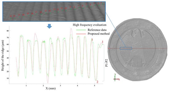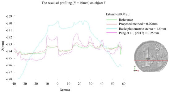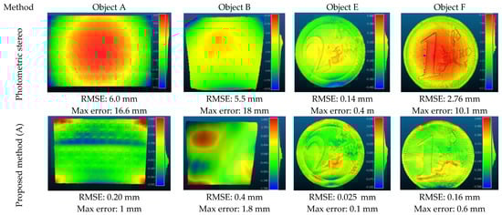 Photometric stereo-based methods, unlike photogrammetry techniques, can reconstruct a very detailed surface’s topography even with non-collaborative objects [,,]. However, owing to some mathematical assumptions, such as parallel light direction and orthogonal projection of the sensor, the global shape deformation typically exists [,,,]. The global shape deviation can vary depending on the surface properties and dimensions of the object. For instance, the generated 3D reconstruction can be deformed with a maximum shape deviation of about 13 mm on a Lambertian flat object with 340 × 270 mm dimensions when ignoring the assumptions mentioned above [,].
