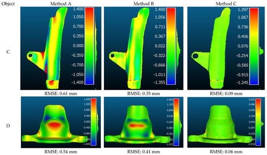 It is worth noting that both the deformed model (from photometric stereo depth map) and reference data (photogrammetric 3D points) should be approximately scaled and aligned before computing the coefficients. The disadvantage of such polynomial adjustment is that the edges and boundaries of complex-geometry surface objects can be smoothed out (e.g., Objects C and D). To preserve the edges for complex-geometry objects, two following approaches (Methods B and C) are afterward presented.