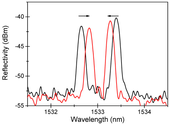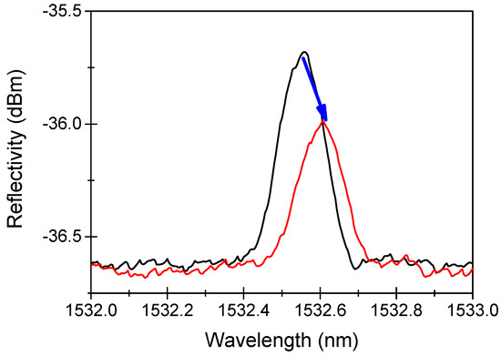 An example of the radiation-induced effects on a Bragg peak reflection spectrum, before (black line) and after (red line) X-ray irradiation at 1.5 MGy TID at RT. Data extracted from [73].