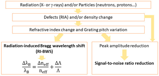 As radiation degrades the fiber transmission through the RIA phenomenon, it can also degrade the FBG performance, as shown in Figure 2, through the two effects highlighted in Figure 3 [13].