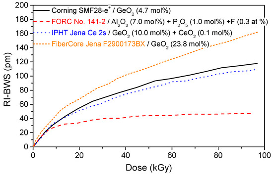 As the radiation response of the OFs strongly depends on the compositions of their core and cladding, the fiber composition also influences the response of the gratings under irradiation. However, it is impossible to determine how, since the grating inscription process itself changes the fiber properties locally. This has been highlighted by Henschel et al., studying the BWS induced by γ-rays on type I-UV gratings inscribed in fibers with differently doped cores: germanium, phosphorous, and cerium [76]. Figure 4 shows a few of their results (extracted from [76]). It can be observed that the grating written in the radiation-sensitive (in terms of RIA) optical fiber co-doped with Al and P shows the smallest RI-BWS among all the reported gratings.