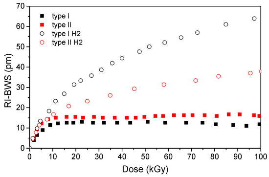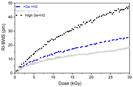 Figure 5 also compares the BWS induced by X-rays on two gratings written with the UV laser in the same fiber, pre-hydrogenated or not before the FBG inscription. In this case, the two gratings were not identical because of the reduced photosensitivity of the unloaded highly Ge-doped fiber compared to the loaded one. Indeed, the FBG written in the H2-loaded fiber (with a laser power of ~90 mW) was only 10 mm long and had a reflectivity of 90% (transmission of −10 dB), whereas the grating inscribed in the unloaded fiber with a higher laser power (about 170 mW) was 20 mm long in order to reach a reflectivity of 50% (transmission of −3 dB). Conscious of these differences, it can be stated that the H2 loading used to enhance the fiber sensitivity to UV light increases also the FBG radiation sensitivity, independently of the fiber composition. With pre-hydrogenation, the RI-BWS saturates at higher levels and at higher doses [75,77]. The probable cause is the radiolytic rupture of the OH-bonds, which are present at higher concentrations in the gratings written in H2-loaded fiber [79].