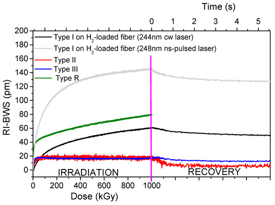 RI-BWS recorded up to 1 MGy at RT on different FBG types written in the same Corning SMF28e+ fiber: two type I FBGs, one written with a CW UV laser (at 244 nm, power density of 4.15 W/cm2) and the other with a 10 ns-pulsed UV laser (at 248 nm, pulse energy of 380 mJ/cm²), in a pre-H2-loaded sample; a type II FBG, written through a PM with an fs-IR laser (at 800 nm, a pulse width of 150 fs, and pulse energy of 560 µJ); a type III FBG, written PbP with an fs-IR laser (at 800 nm, a pulse width < 120 fs, and pulse energy of 230 nJ); an R-FBG, manufactured from a type I grating written with a 20 ns-pulsed UV laser (at 248 nm and pulse energy of 9 mJ) and regenerated at 750 °C. The vertical pink line indicates the irradiation end. The dose rate was always 50 Gy/s for all the gratings except for the regenerated one at 10 Gy/s. Data extracted from [74,83].