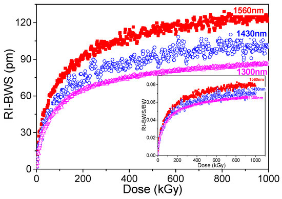 Among the inscription conditions, there is also the grating period, which rules the Bragg wavelength. Figure 8 reports the shift induced on three similar type I gratings, having the same amplitude of the refractive index modulation and submitted to the same treatments before and after inscription, but written at different Bragg wavelengths: 1300 nm, 1430 nm, and 1560 nm. By increasing the latter, the RI-BWS increases (from ~85 pm for 1300 nm to ~125 pm for 1560 nm at 1 MGy); however, once normalized by the initial Bragg wavelength of each grating (see inset of Figure 8), only a slight dependence can be observed, suggesting that the same variation of the refractive index occurs in all the gratings.
