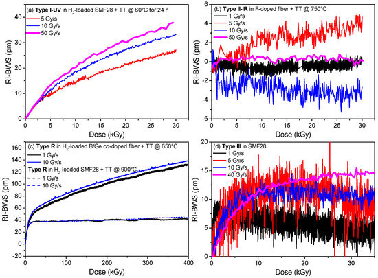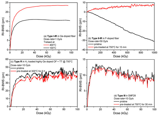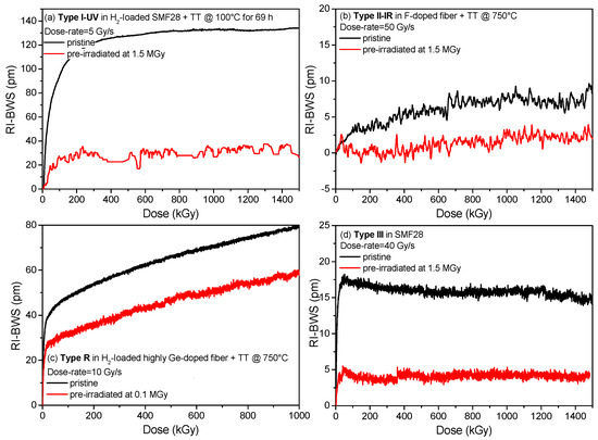 In the next sections, we will focus on the RI-BWS. Since the Bragg peak translates into the value of the external parameter changes that the FBG is sensing, RI-BWS corresponds to an error in the measurement. For example, for an FBG having a thermal sensitivity coefficient of 10 pm/°C and a strain coefficient of 1.2 pm/µε, a RI-BWS of about 10 pm will correspond to an error of about 1 °C or 8 µε in the temperature or strain measurements, respectively. Moreover, it has been demonstrated several times that the thermal sensitivity and strain coefficients are not significantly influenced by radiation [75].